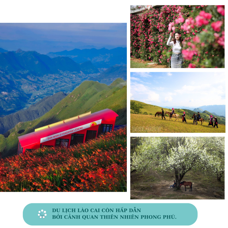Du lịch Lào Cai còn hấp dẫn bởi cảnh quan thiên nhiên phong phú. Nhắc tới Lào Cai là nhắc tới vùng đất nổi tiếng với thiên nhiên kỳ vĩ, như đỉnh Fansipan – nóc nhà của Đông Dương; các dãy núi trùng điệp; thung lũng và ruộng bậc thang trải dài đến chân trời, như Mường Hoa, Nậm Cang (thị xã Sa Pa), Y Tý, Ngải Thầu (Bát Xát); khí hậu cận ôn đới, mát mẻ quanh năm. Lào Cai nổi tiếng với Khu du lịch quốc gia Sa Pa đã được nhiều tạp chí du lịch quốc tế bình chọn là một trong những thị trấn nhỏ đẹp nhất thế giới năm 2023 và tốp điểm đến thịnh hành nhất thế giới năm 2024. Ngoài ra, Lào Cai còn có Vườn Quốc gia Hoàng Liên với hệ sinh thái đa dạng, dự trữ nhiều nguồn gen quý về động, thực vật; Bát Xát, Bắc Hà là điểm đến thú vị cho khách du lịch…